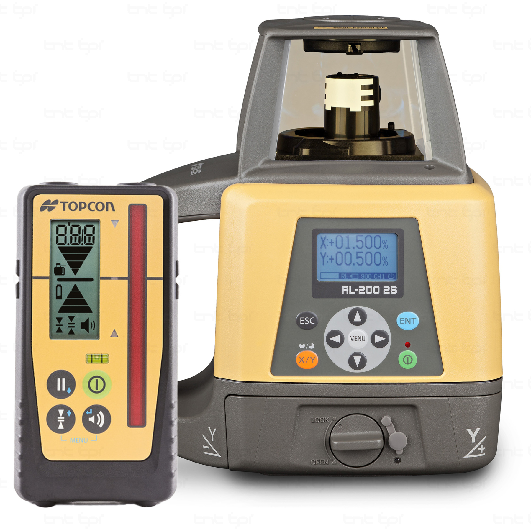 Для зручності щоденної роботи передбачено великий контрастний графічний дисплей, на якому зручно контролювати поточні ухили та параметри роботи. Прилад підтримує маскування секторів (електронний shutter до 3 квадрантів), вибір швидкості обертання та систему HI alert, яка попереджає про зміщення лазера. Для моделі RL-200 2S також доступне дистанційне керування RC-400, що дозволяє змінювати налаштування, перевіряти стан роботи та контролювати батарею без підходу до самого лазера.